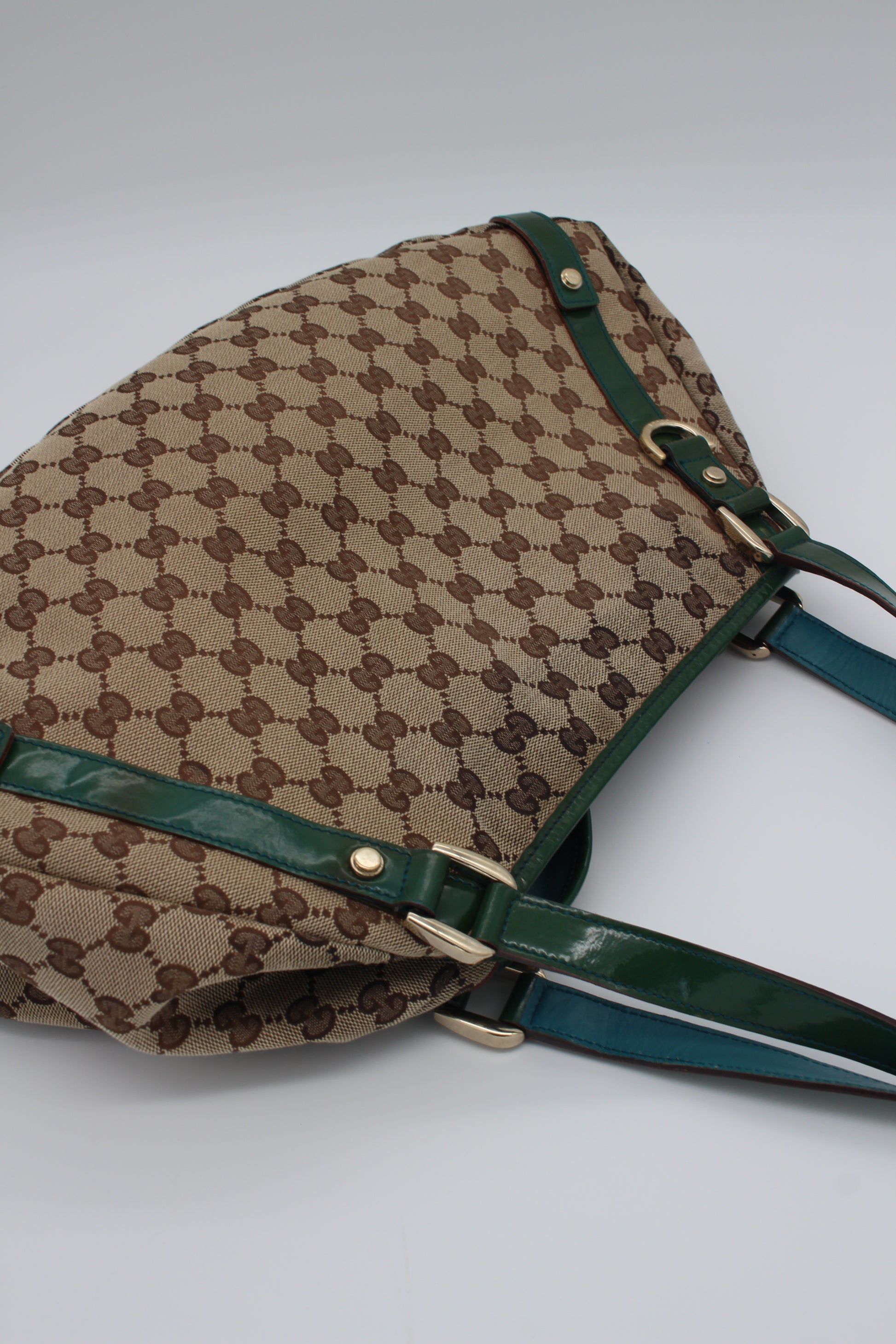 This pre-loved Gucci bag is crafted from beige GG canvas, accented with green leather and gold-tone hardware. The serial number is 130736 00212.