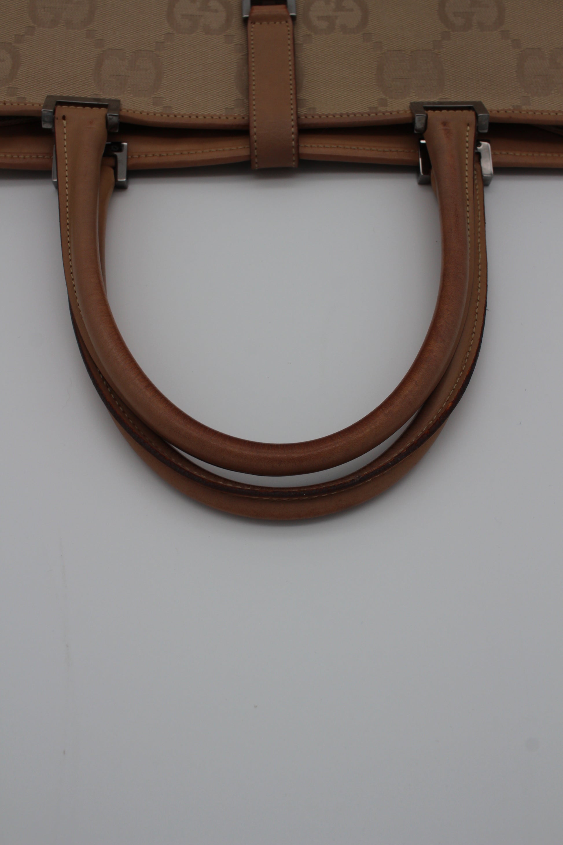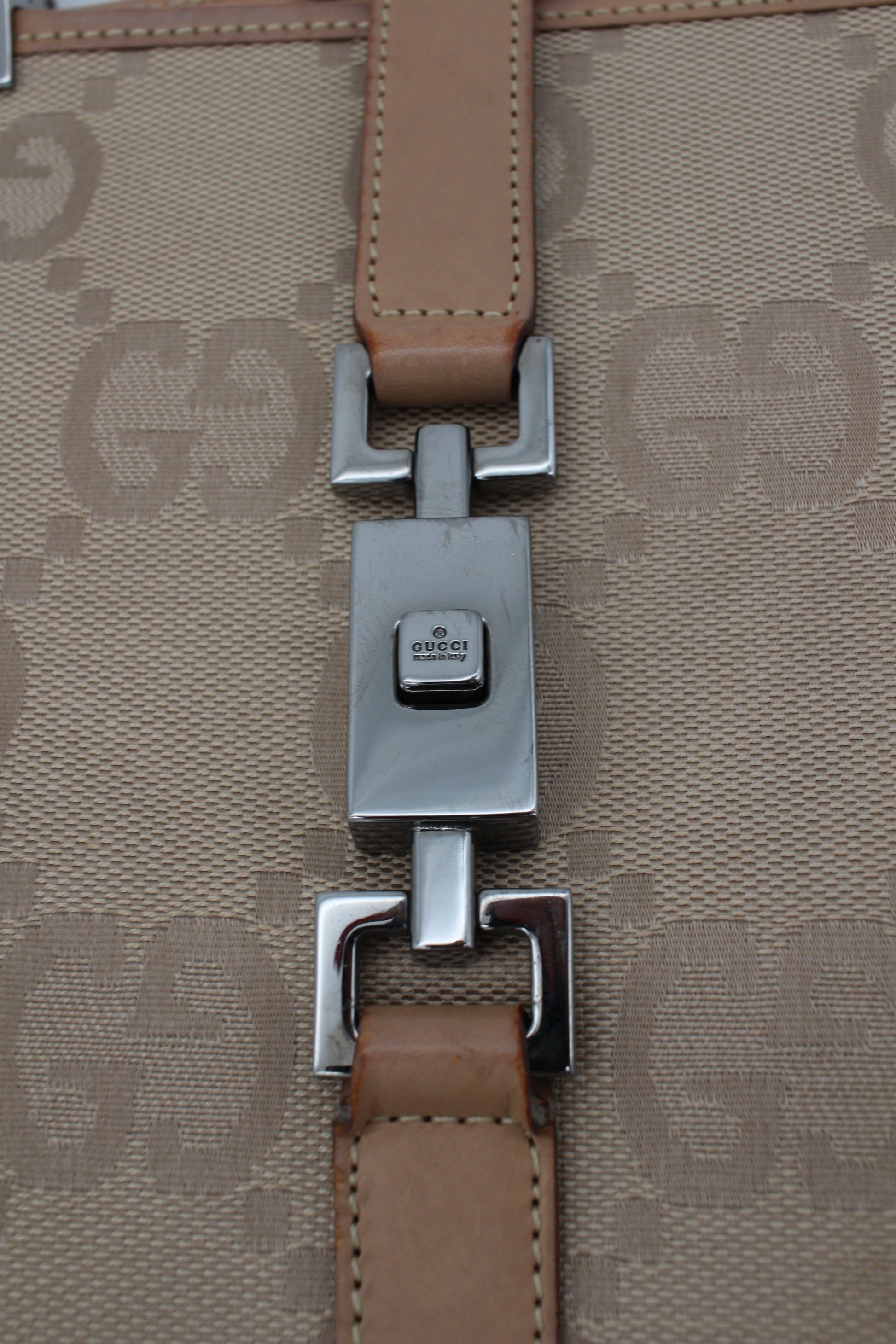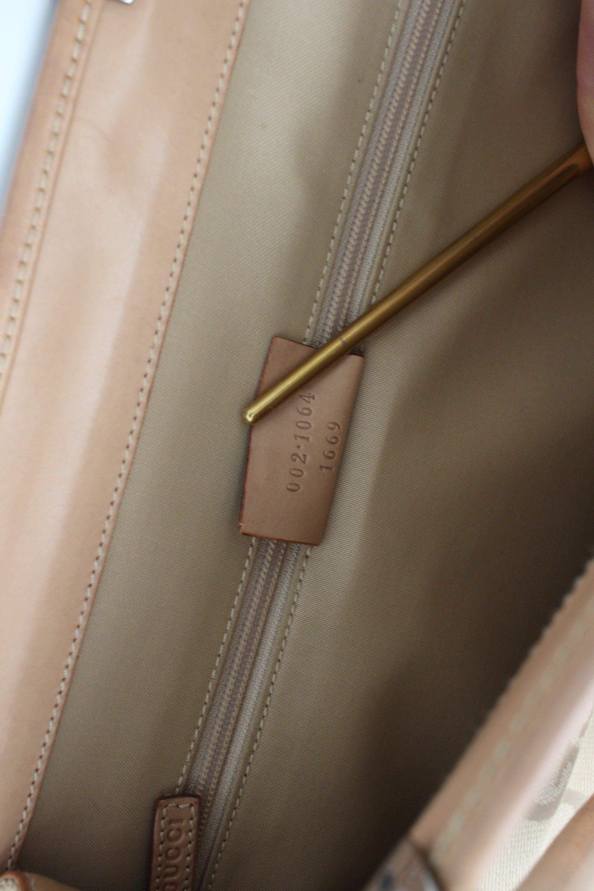 This pre-loved Gucci bag is made from beige GG canvas with beige leather details and silver-tone hardware. The bag has a hook closure and inside there is one zip pocket. The serial number is 0021064 1669.