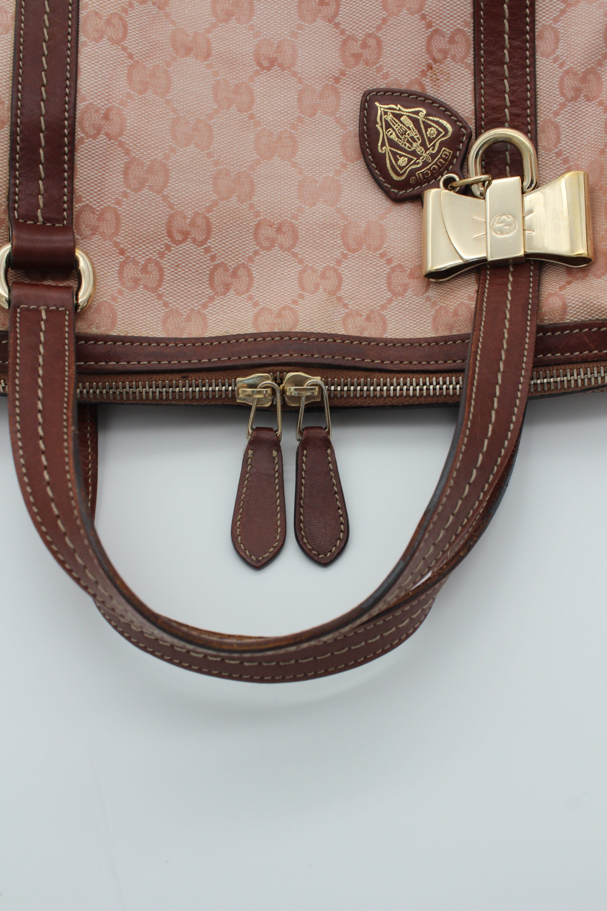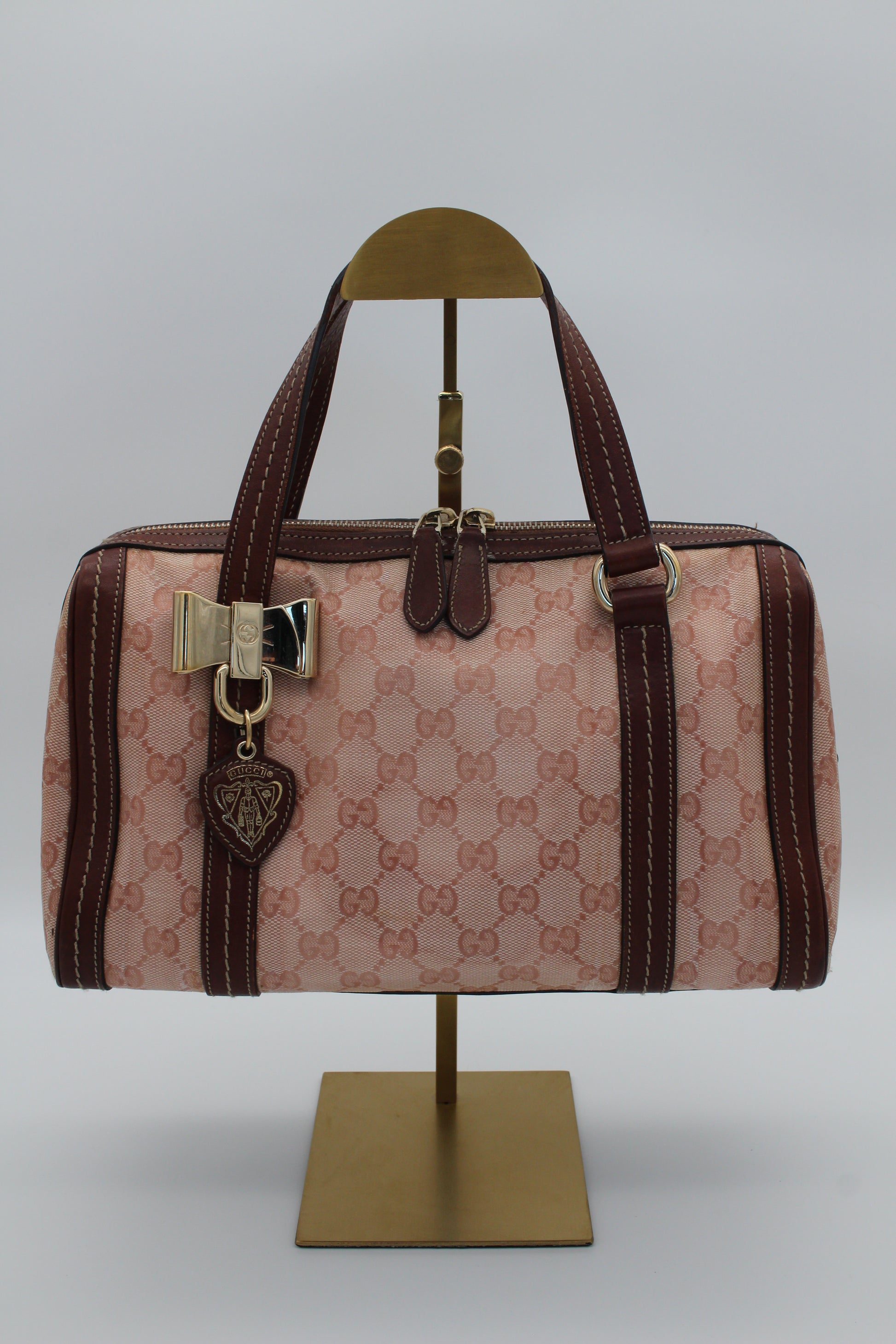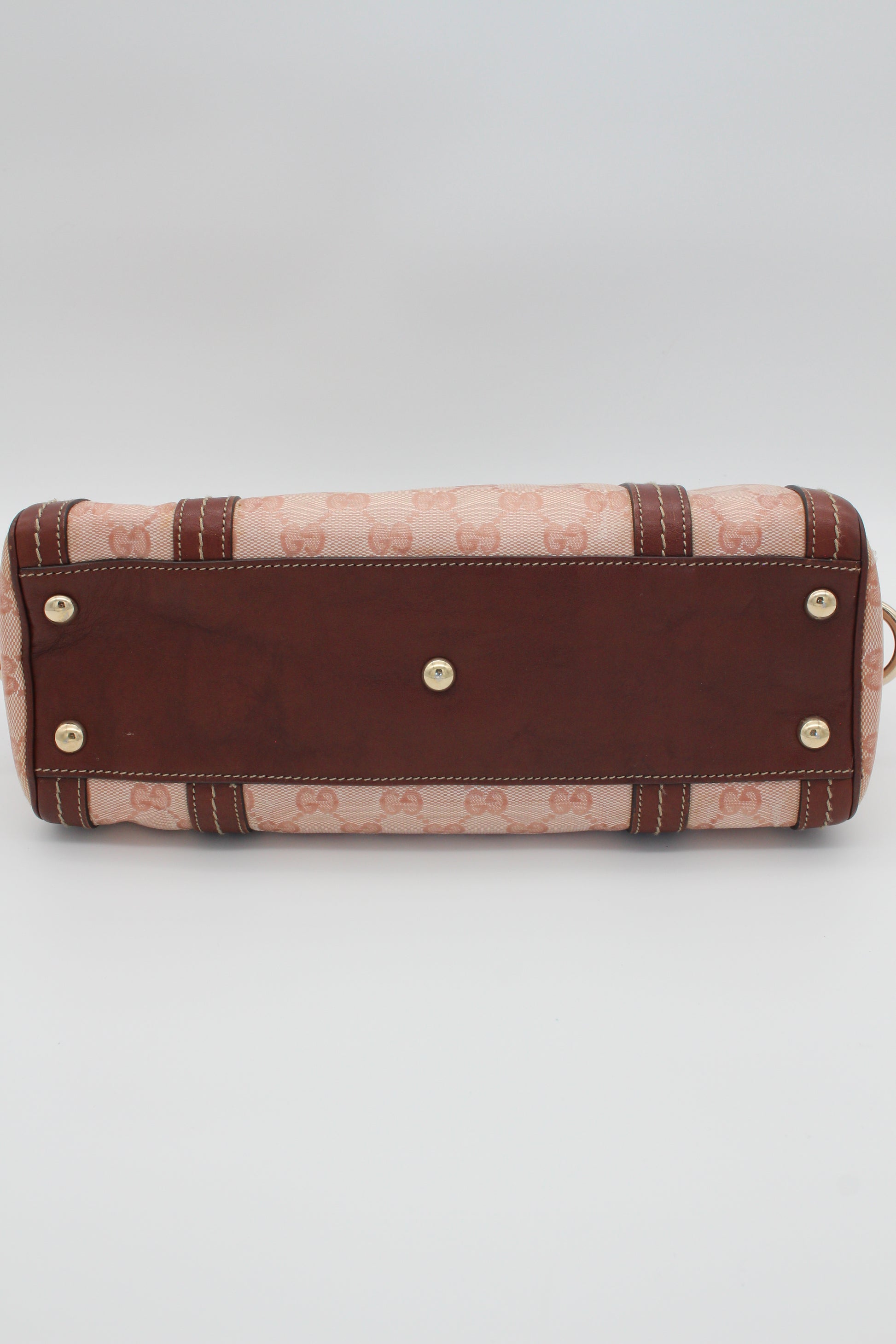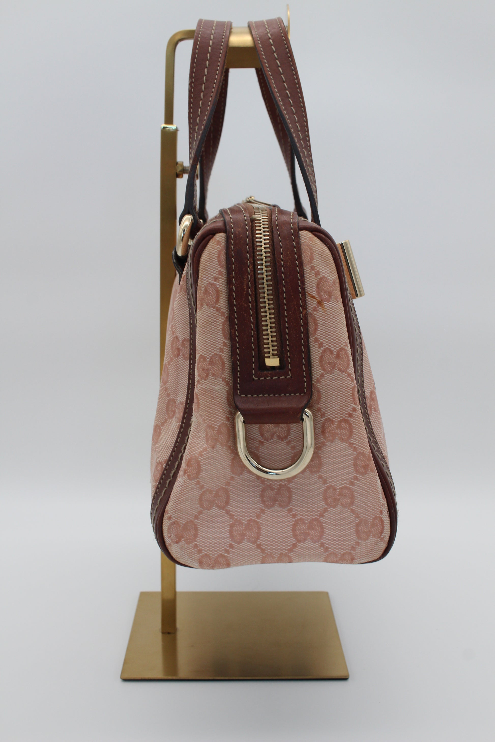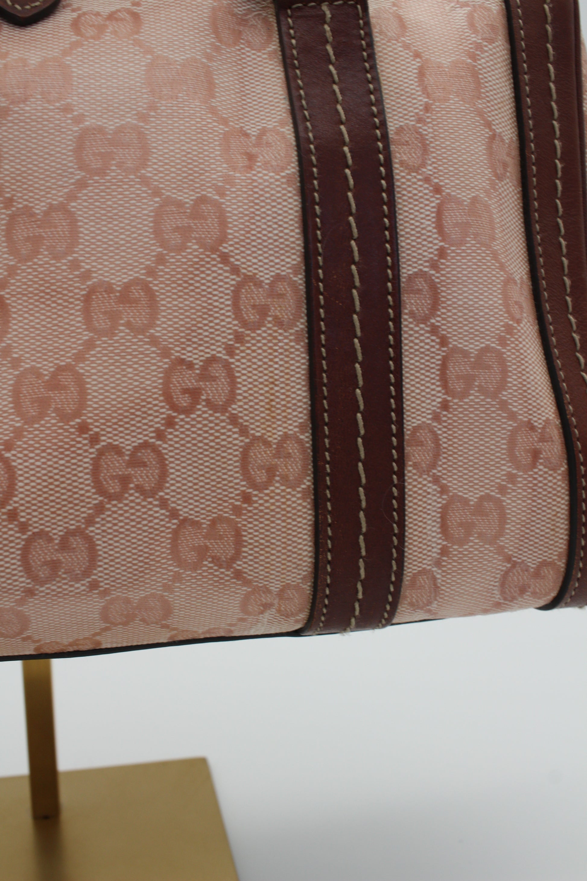 This pre-loved Gucci bag is crafted from pink GG-coated canvas, accented with brown leather details and gold-tone hardware. Inside, the bag features a zippered pocket and two open pockets. The serial number is 181487 002058.