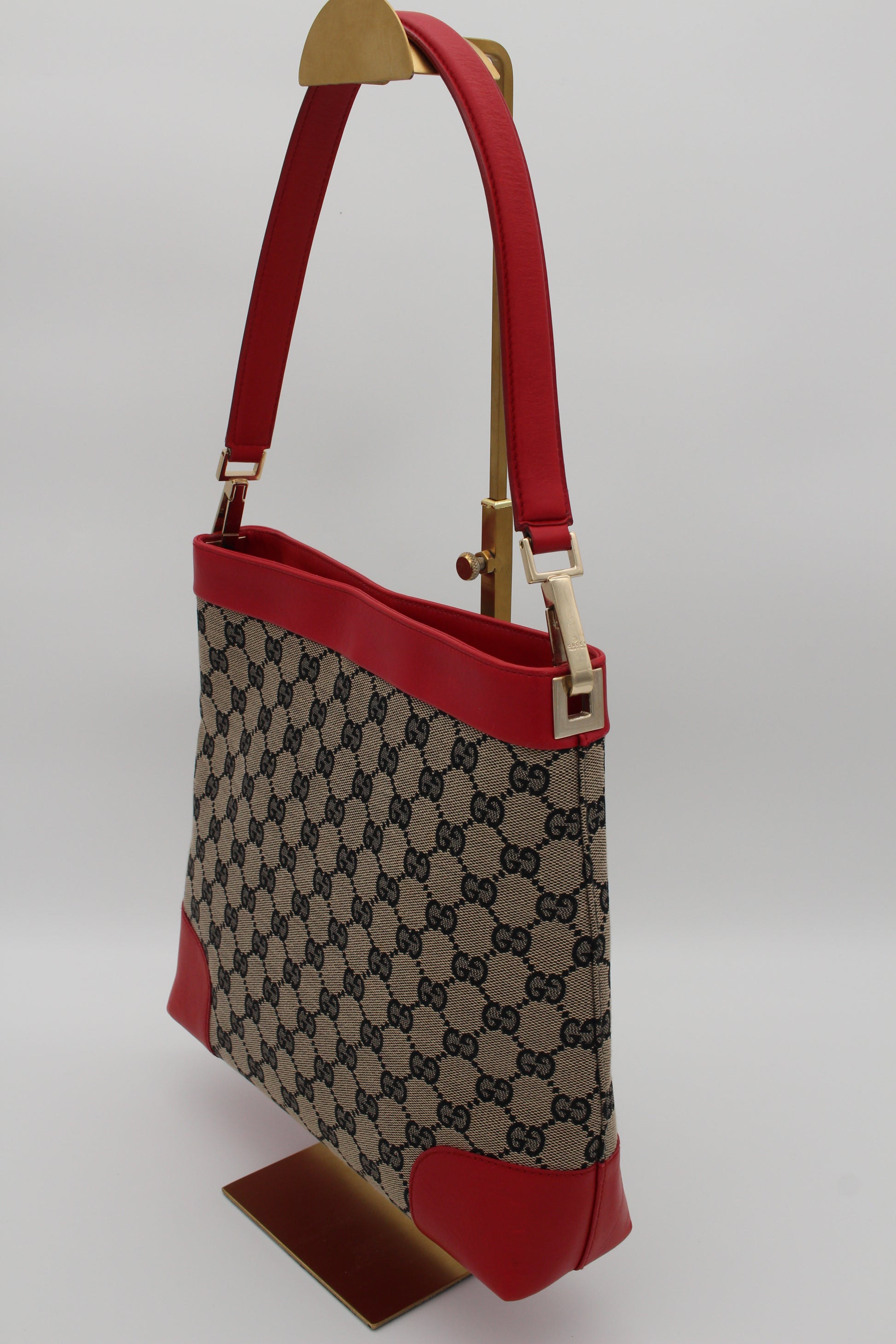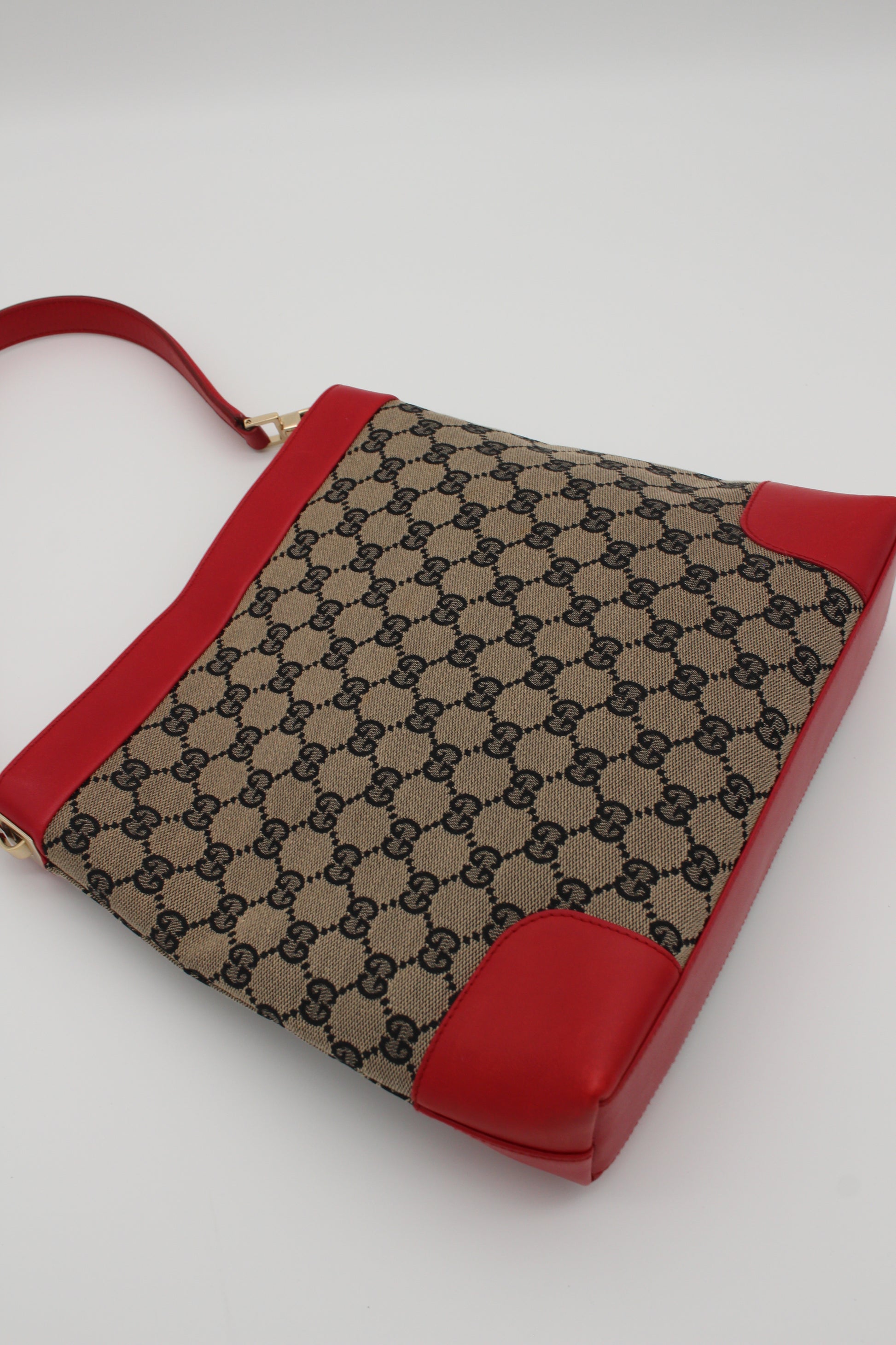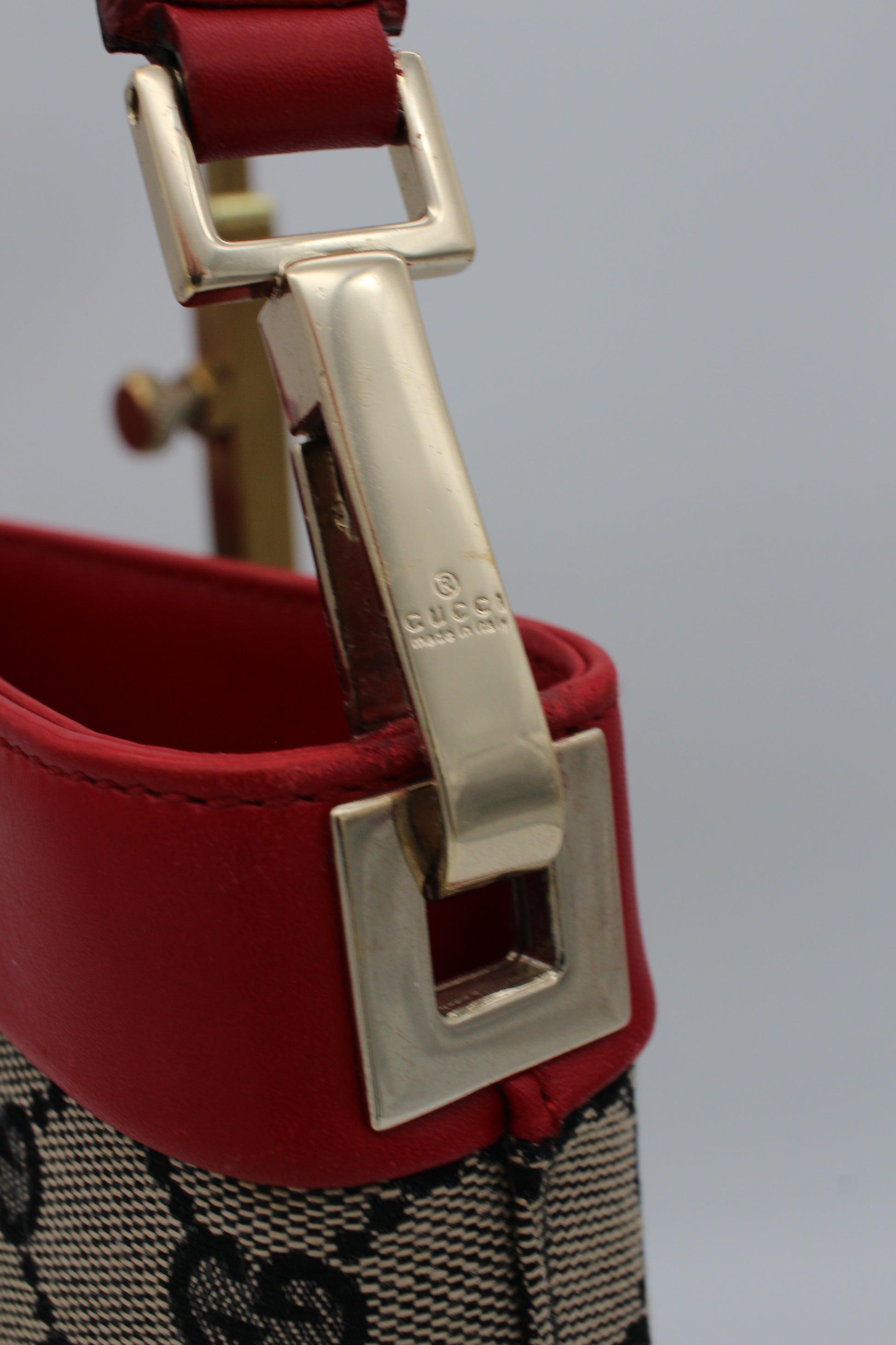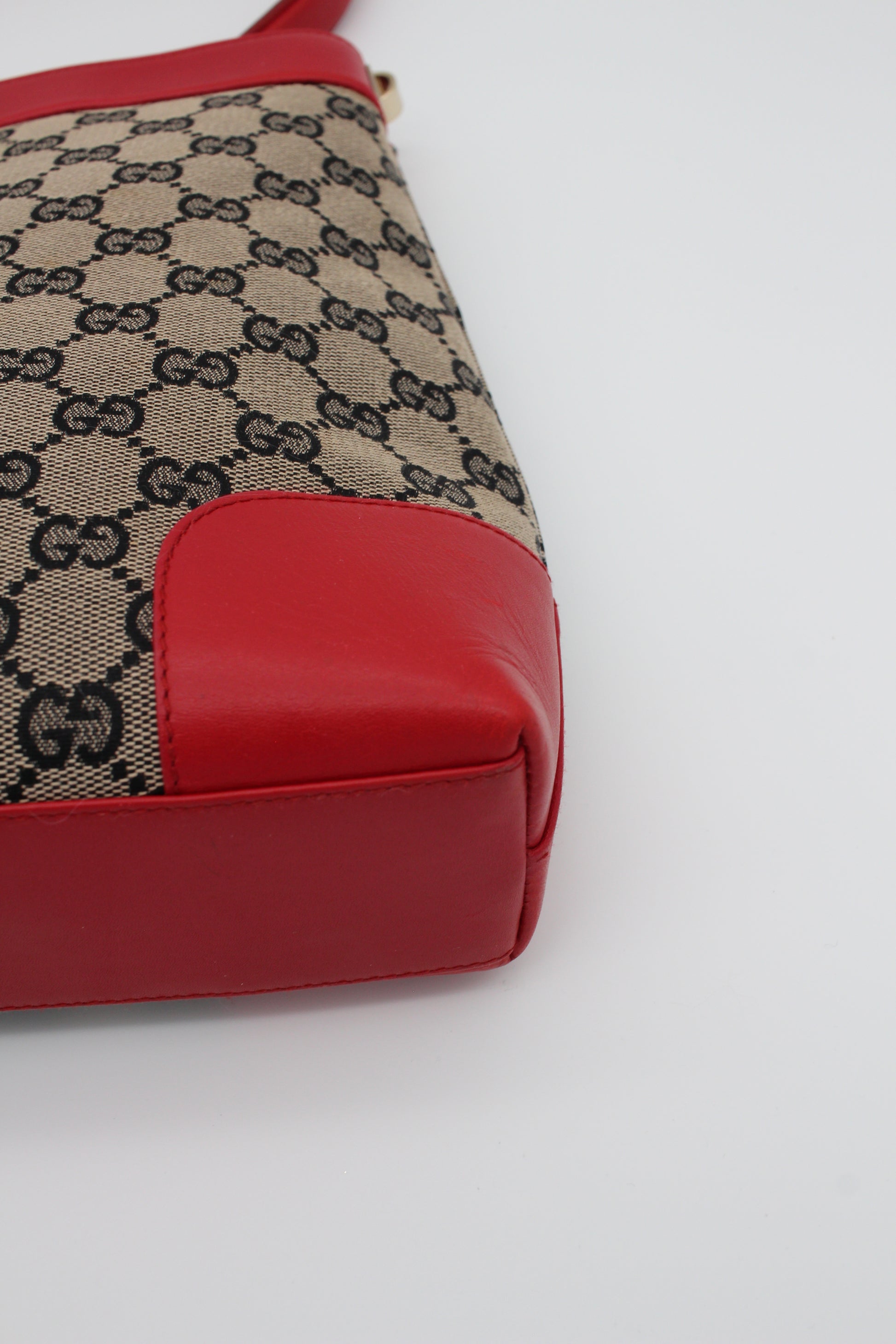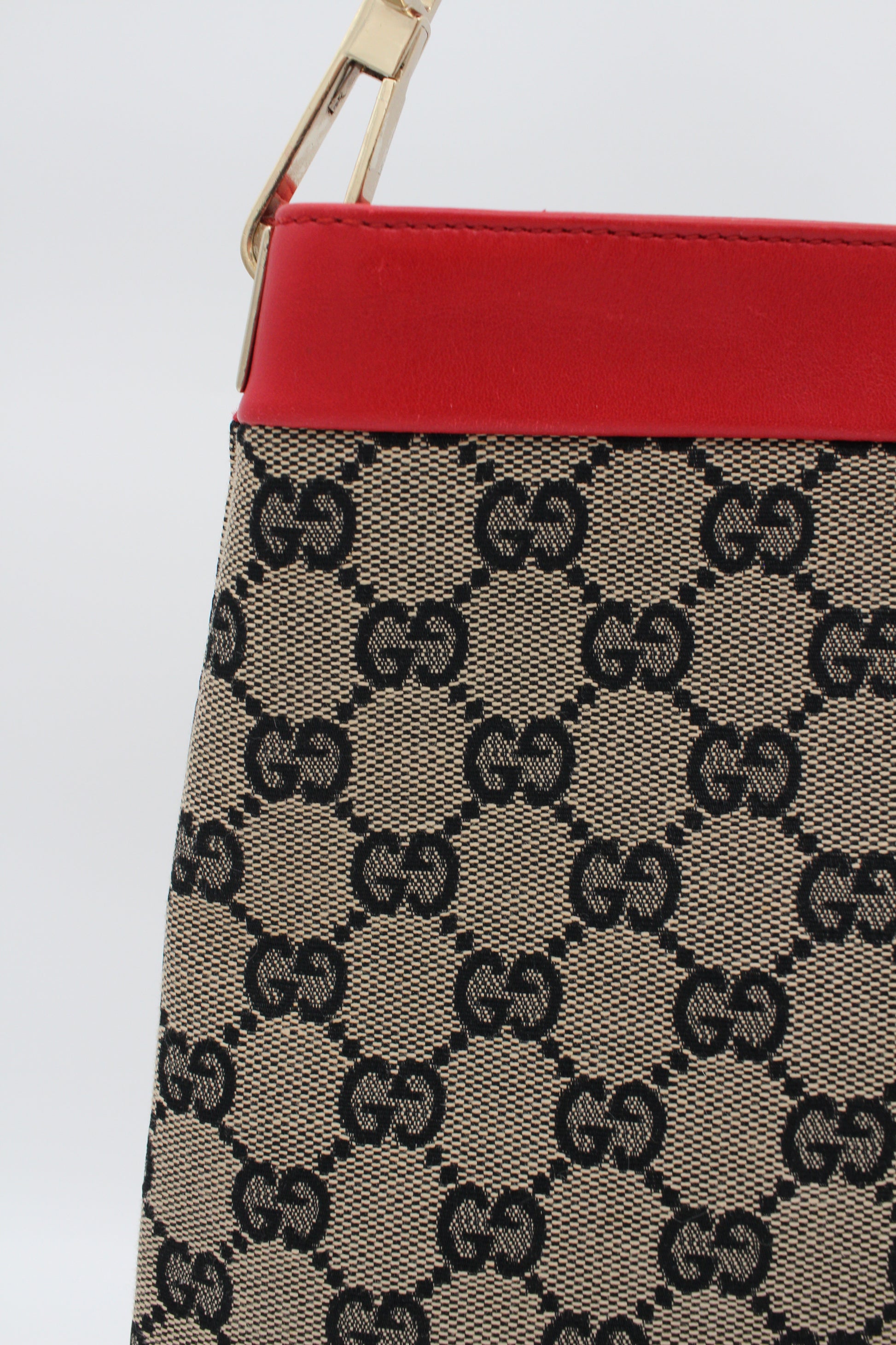 This pre-loved Gucci bag is crafted from beige GG canvas with red leather details and gold-tone hardware. The bag has a button closure and inside there is one zip pocket. The serial number is 001 4231 001998.