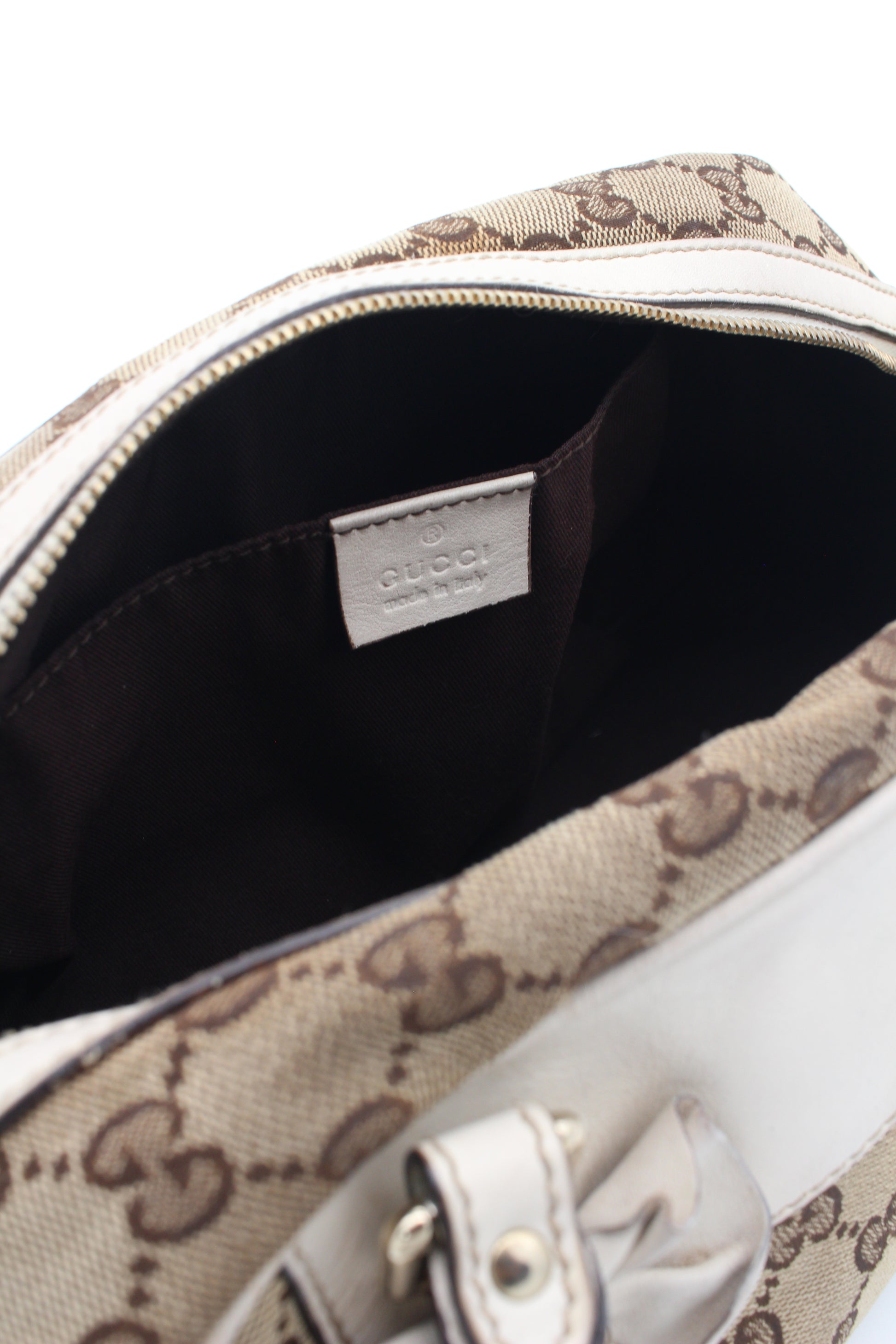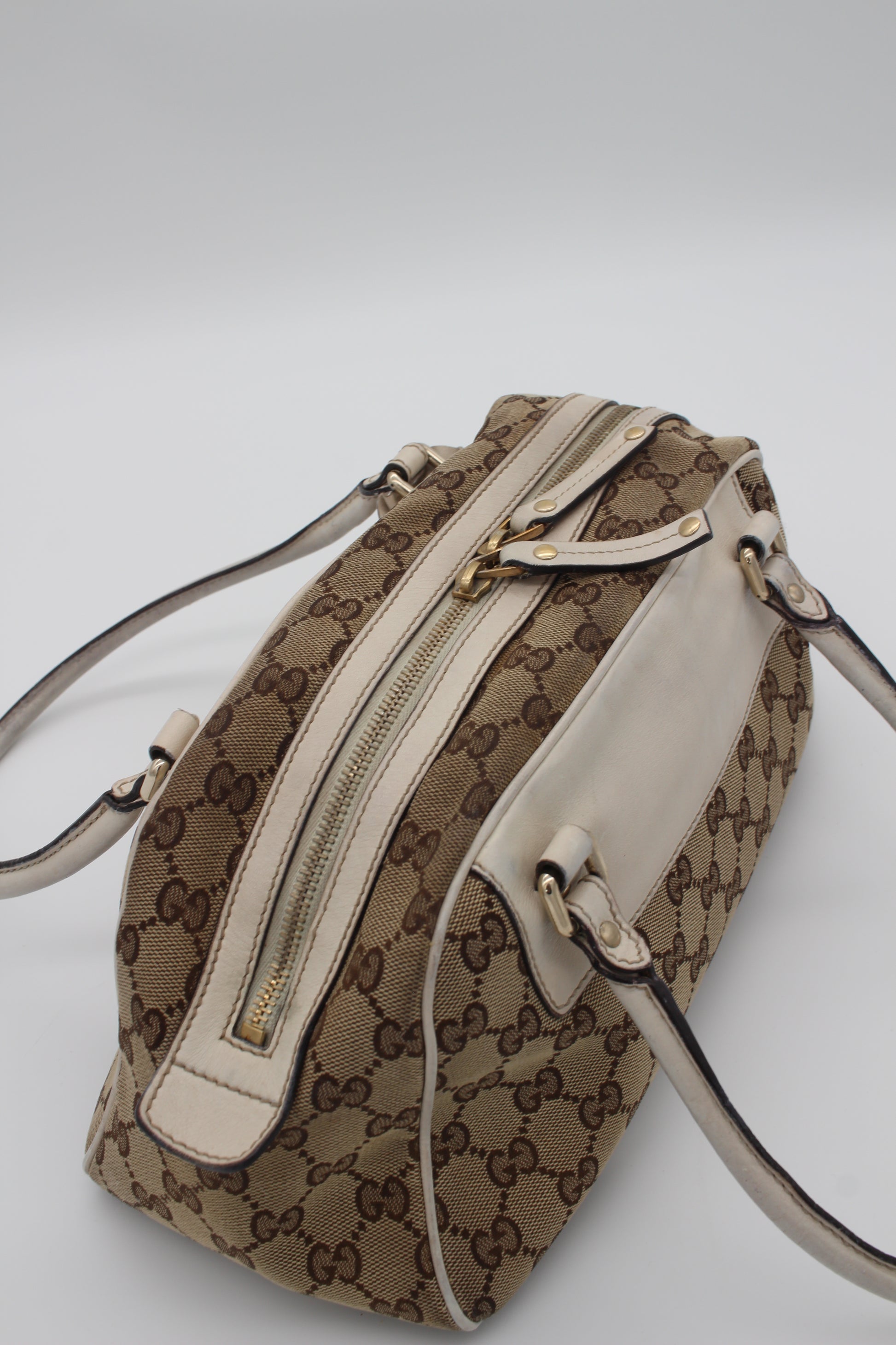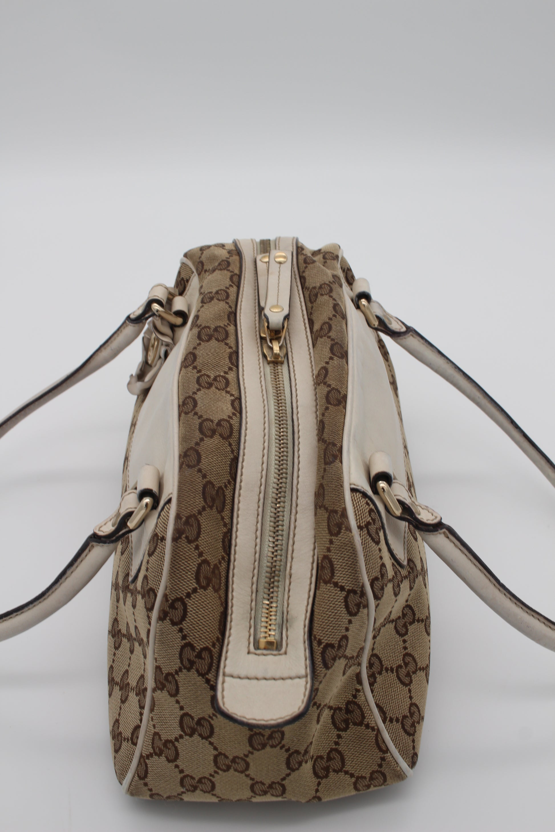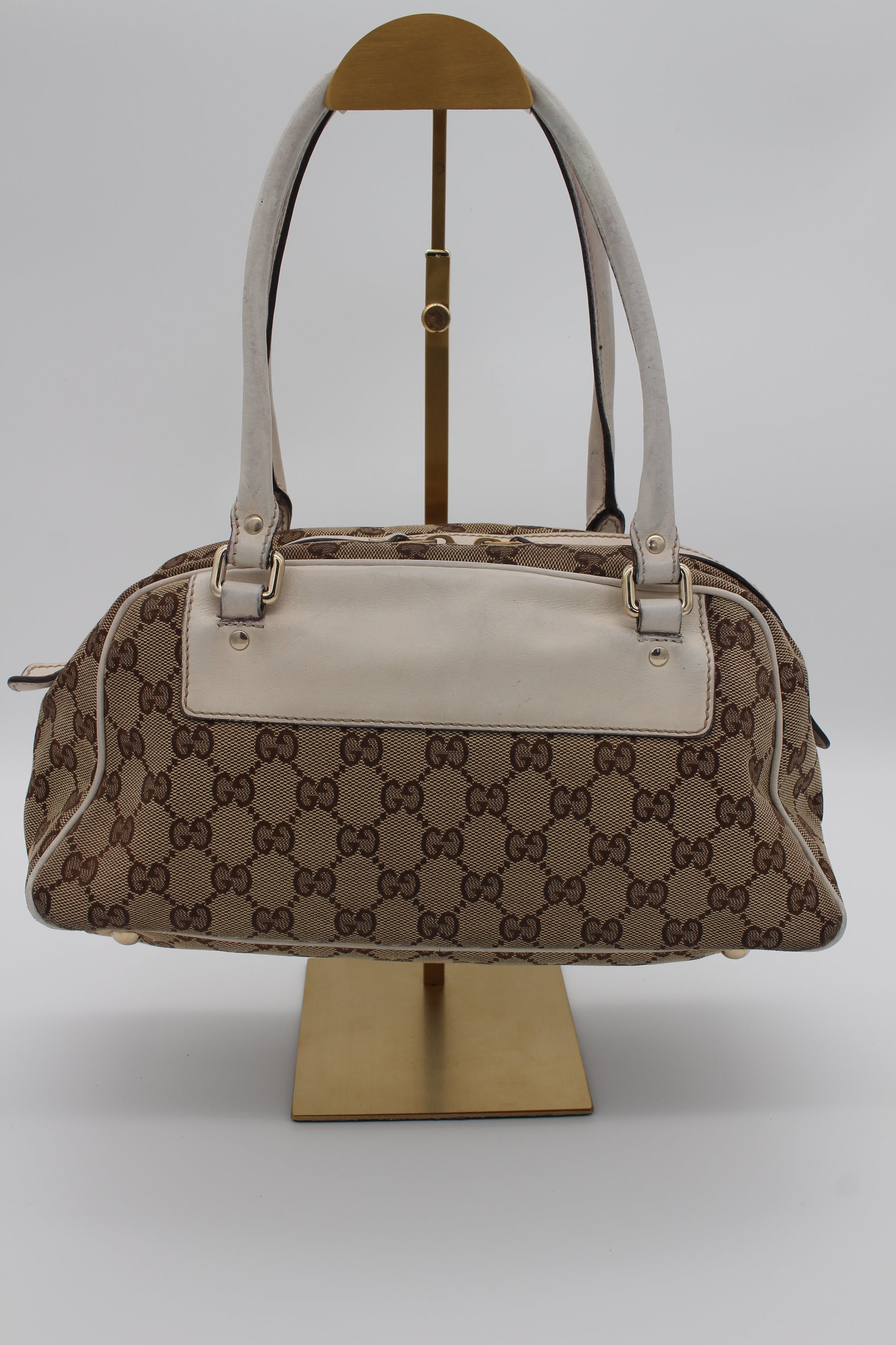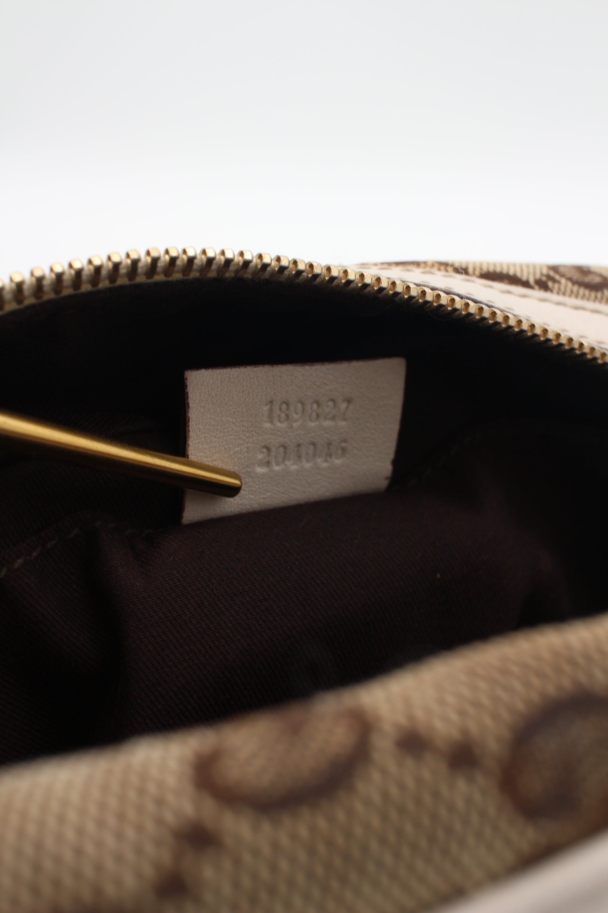 This pre-loved Gucci bag is crafted from beige GG canvas, accented with ivory leather and gold-tone hardware. Inside there is one main compartment with a small pocket. The serial number is 189827 204046.